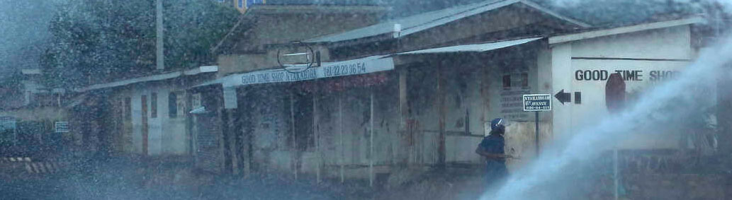 De foto is een detail van Voanews: Waterkanon bij dreigende onlust.