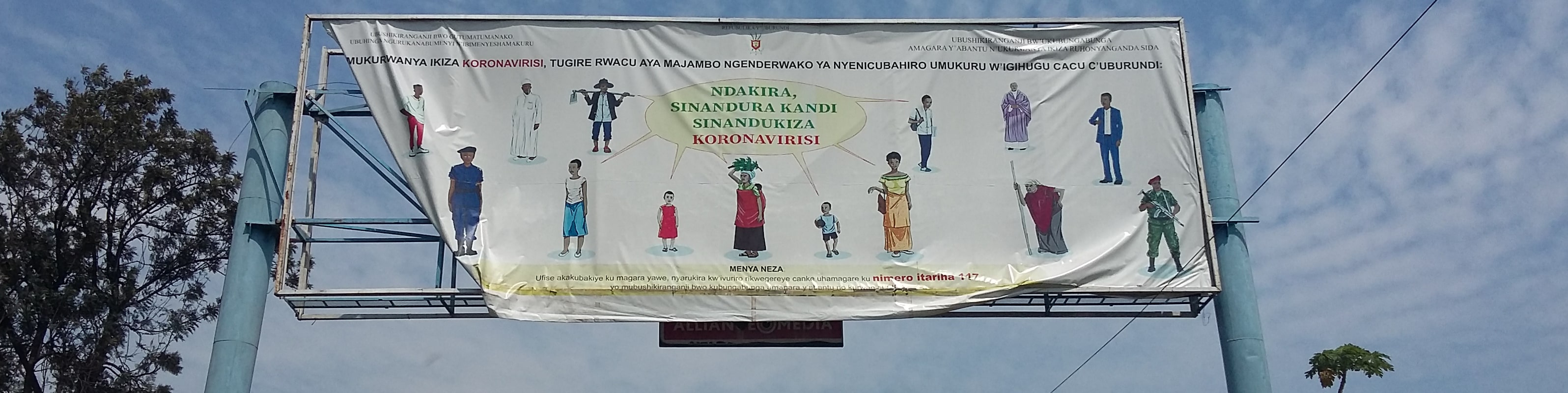 Het spandoek op de foto, dat hangt aan de rand van Bujumbura Stad, is bedoeld als waarschuwing tegen Covid-19.